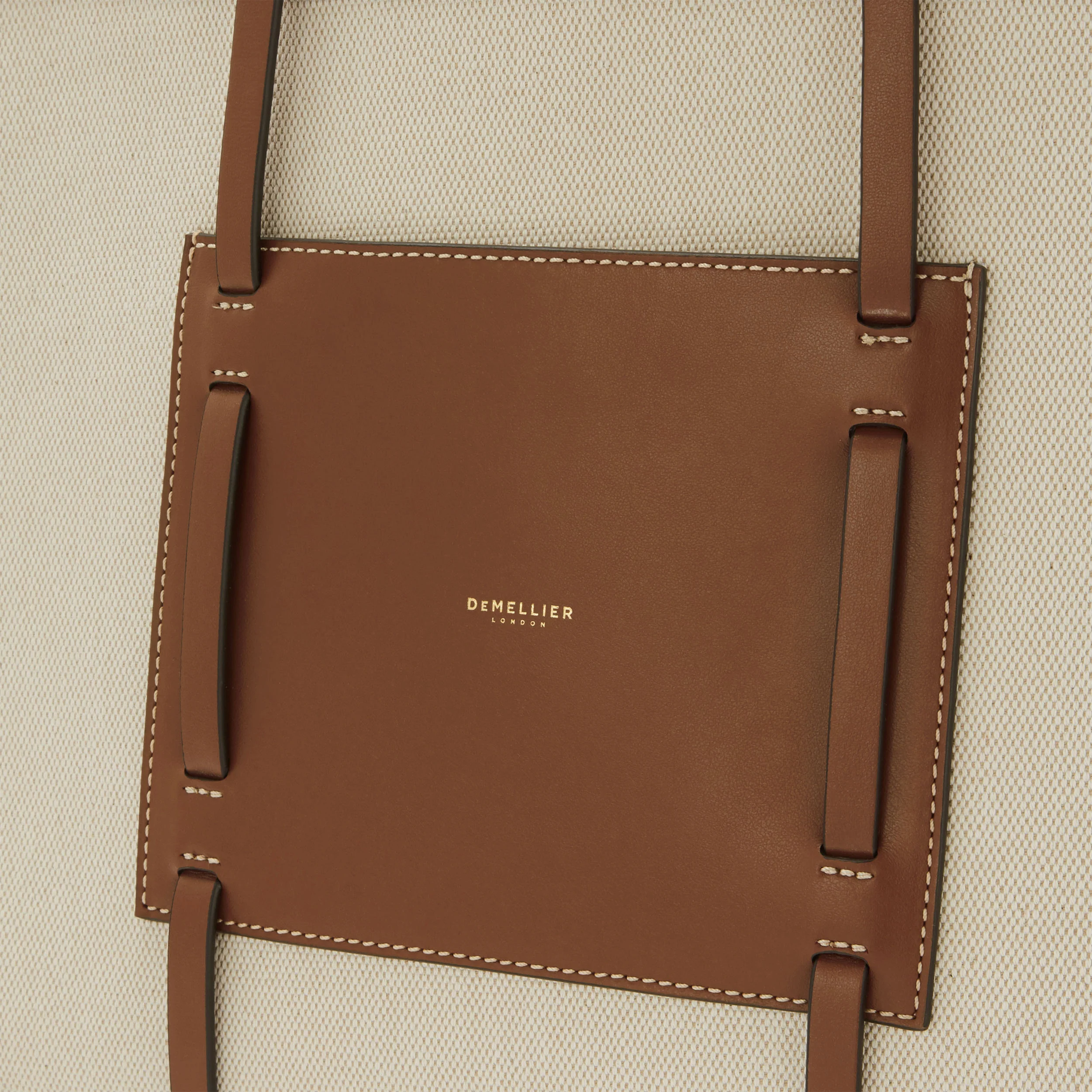 Exterior: Double top handles, gold-certified Italian leather trim with Ecru stitching, front slip pocket, leather base, gold-plated feet, foil embossed DeMellier logo.